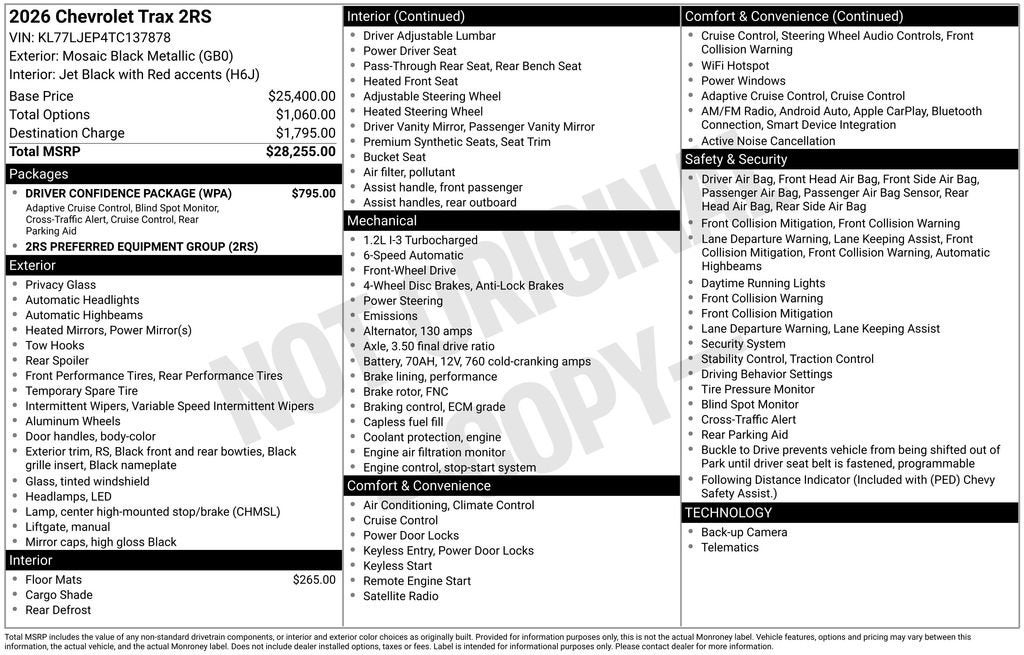 Mosaic Black Metallic 2026 Chevrolet Trax 2RS FWD 6-Speed Automatic ECOTEC 1.2L Turbo Multi Point Service Inspection.