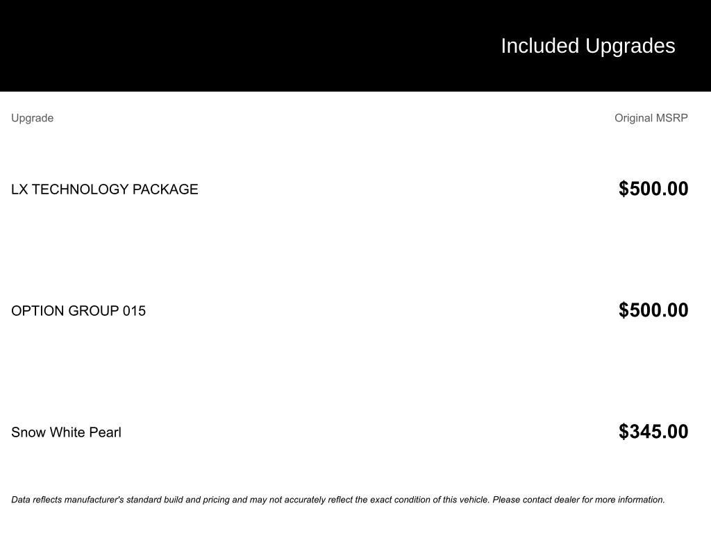 • LX Technology Package with Blind-Spot Collision-Avoidance Assist, Lane Change Assist, and Rear Cross-Traffic Collision Avoidance Assist